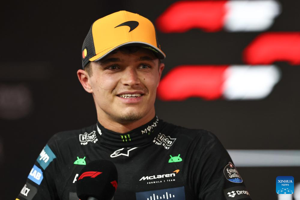 SAKHIR, 12 abril, 2025 (Xinhua) -- Imagen del 11 de abril de 2025 del piloto británico de la escudería McLaren, Lando Norris, siendo entrevistado al término de la segunda sesión de prácticas libres del Gran Premio de Bahréin de Fórmula Uno, en el Circuito Internacional de Bahréin, en Sakhir, Bahréin. (Xinhua/Qian Jun)