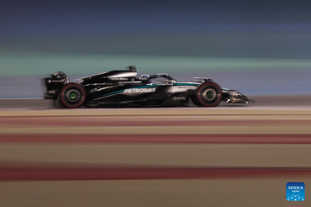 SAKHIR, 12 abril, 2025 (Xinhua) -- Imagen del 11 de abril de 2025 del piloto británico de la escudería Mercedes, George Russell, conduciendo durante la segunda sesión de prácticas libres del Gran Premio de Bahréin de Fórmula Uno en el Circuito Internacional de Bahréin, en Sakhir, Bahréin. (Xinhua/Qian Jun)