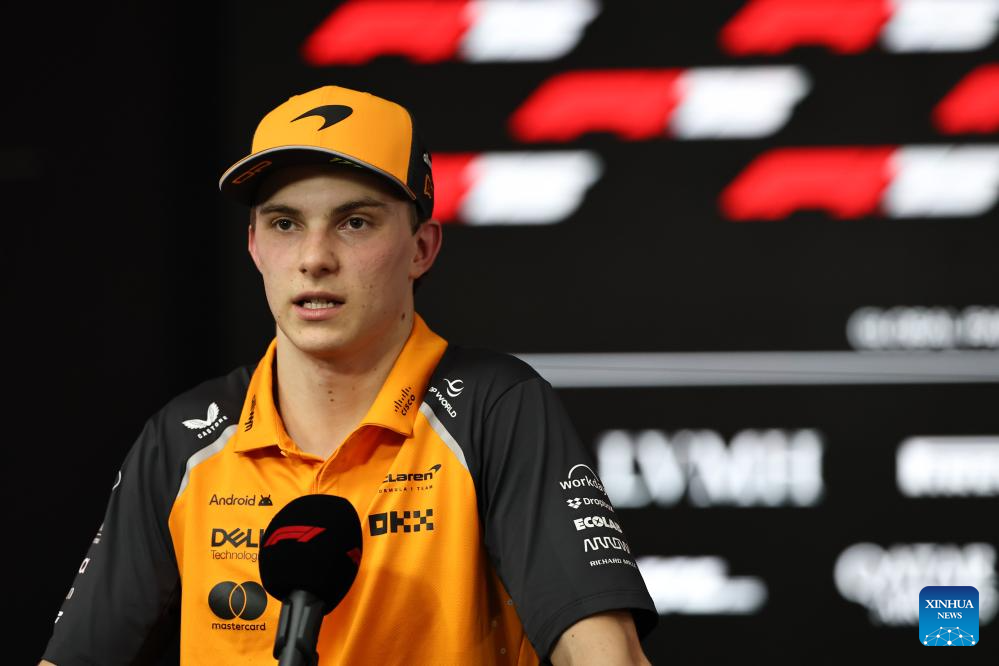 SAKHIR, 12 abril, 2025 (Xinhua) -- Imagen del 11 de abril de 2025 del piloto australiano de la escudería McLaren, Oscar Piastri, siendo entrevistado al término de la segunda sesión de prácticas libres del Gran Premio de Bahréin de Fórmula Uno en el Circuito Internacional de Bahréin, en Sakhir, Bahréin. (Xinhua/Qian Jun)