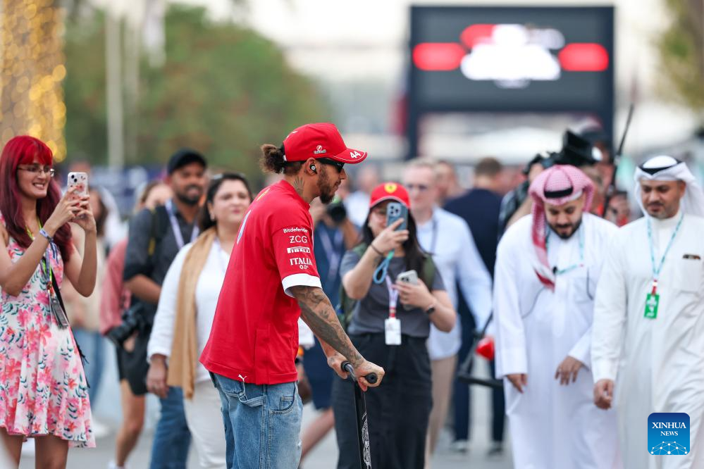 SAKHIR, 12 abril, 2025 (Xinhua) -- Imagen del 11 de abril de 2025 del piloto británico de la escudería Ferrari, Lewis Hamilton (frente), visto en el paddock previo a la segunda sesión de prácticas libres del Gran Premio de Bahréin de Fórmula Uno en el Circuito Internacional de Bahréin, en Sakhir, Bahréin. (Xinhua/Qian Jun)
