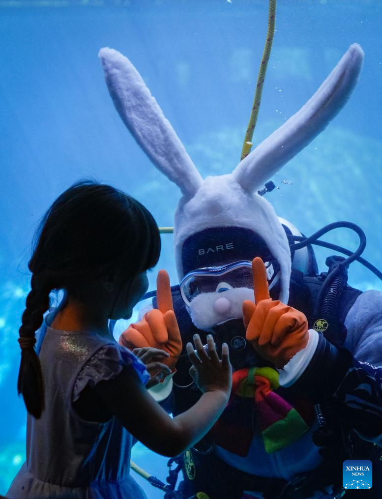 VANCOUVER, 13 abril, 2025 (Xinhua) -- Imagen del 12 de abril de 2025 de un buzo vestido como el Conejo de Pascua interactuando con una niña a través del vidrio de un tanque gigante, como parte de las celebraciones de Pascua en el Acuario de Vancouver, en Vancouver, Columbia Británica, Canadá. (Xinhua/Liang Sen/Xinhua)