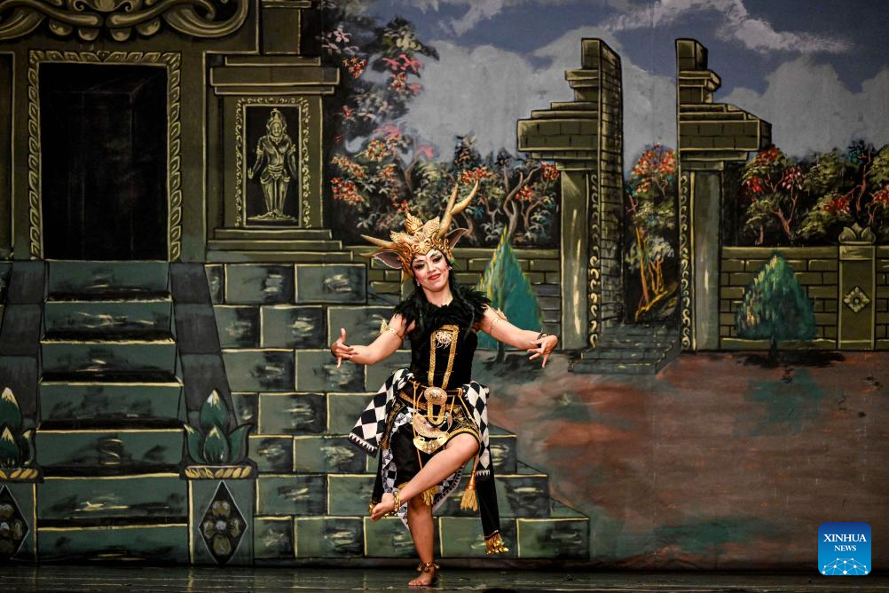 YAKARTA, 13 abril, 2025 (Xinhua) -- Imagen del 20 de diciembre de 2024 de una bailarina realizando una presentación de Wayang Orang en el Teatro Wayang Orang Sriwedari, en Surakarta, en la provincia de Java Central, Indonesia. El Wayang, una forma teatral única considerada la joya de la corona cultural de Indonesia, consiste principalmente en marionetas de sombras (Wayang Kulit en indonesio), marionetas de madera (Wayang Golek en indonesio) y marionetas humanas (Wayang Orang en indonesio). (Xinhua/Agung Kuncahya B.)