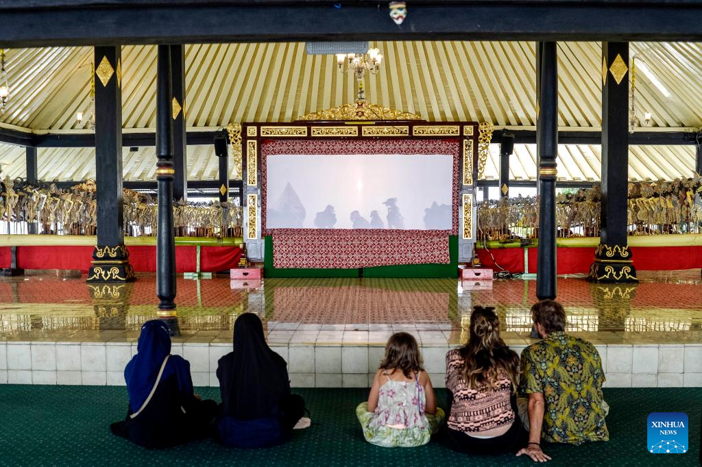 YAKARTA, 13 abril, 2025 (Xinhua) -- Imagen del 9 de enero de 2025 de personas observando un espectáculo de Wayang Kulit en el complejo del Palacio de Yogyakarta, en Yogyakarta, Indonesia. El Wayang, una forma teatral única considerada la joya de la corona cultural de Indonesia, consiste principalmente en marionetas de sombras (Wayang Kulit en indonesio), marionetas de madera (Wayang Golek en indonesio) y marionetas humanas (Wayang Orang en indonesio). (Xinhua/Agung Kuncahya B.)