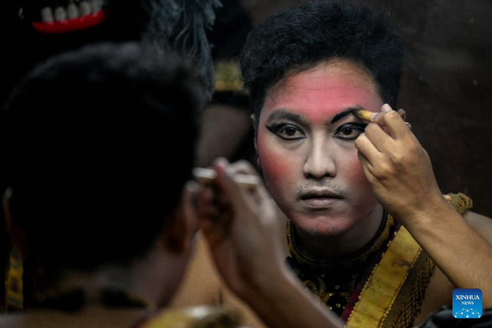 YAKARTA, 13 abril, 2025 (Xinhua) -- Imagen del 20 de diciembre de 2024 de un bailarín preparándose para realizar una presentación de Wayang Orang en el Teatro Wayang Orang Sriwedari, en Surakarta, en la provincia de Java Central, Indonesia. El Wayang, una forma teatral única considerada la joya de la corona cultural de Indonesia, consiste principalmente en marionetas de sombras (Wayang Kulit en indonesio), marionetas de madera (Wayang Golek en indonesio) y marionetas humanas (Wayang Orang en indonesio). (Xinhua/Agung Kuncahya B.)