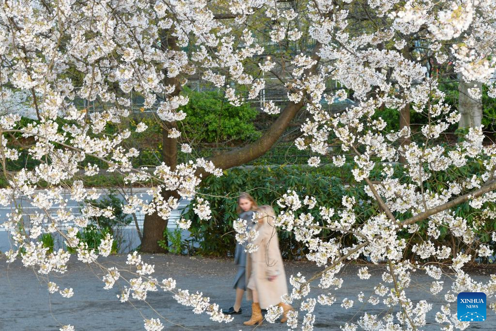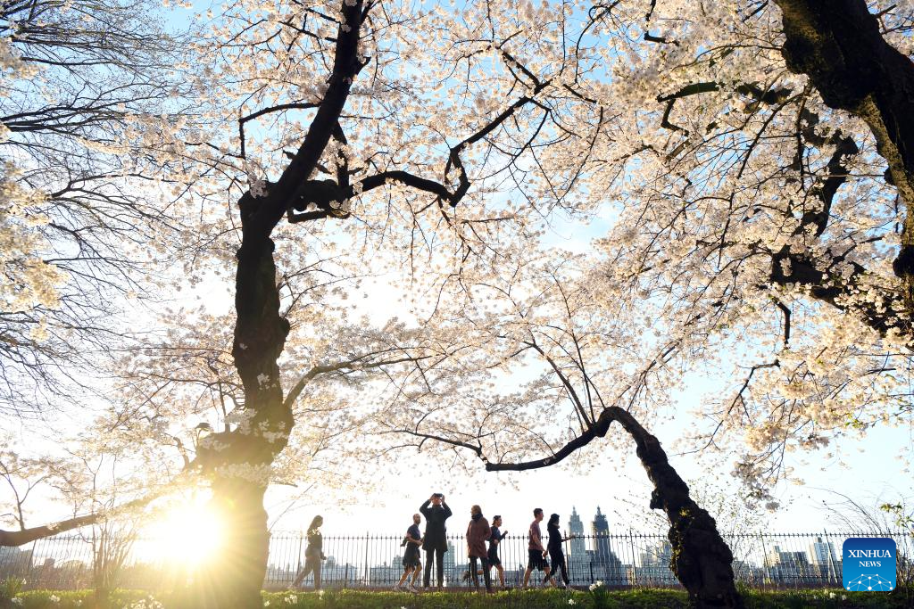 NUEVA YORK, 14 abril, 2025 (Xinhua) -- Imagen del 13 de abril de 2025 de personas caminando junto a flores de cerezo, en Central Park, en Nueva York, Estados Unidos. (Xinhua/Li Rui)