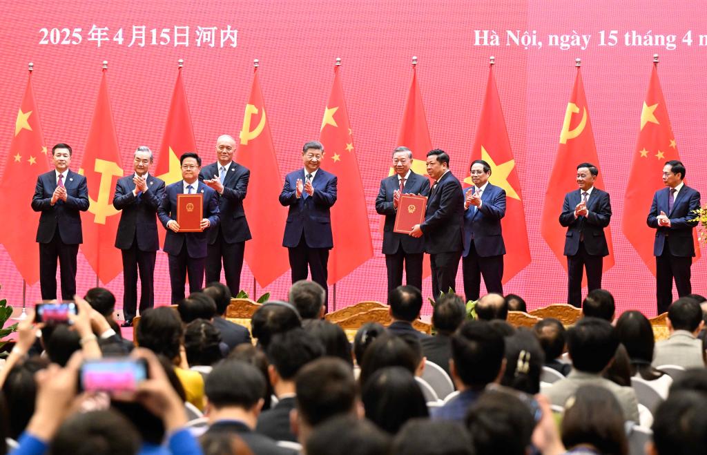 El presidente chino, Xi Jinping, también secretario general del Comité Central del Partido Comunista de China (PCCh), el secretario general del Comité Central del Partido Comunista de Vietnam, To Lam, y el primer ministro vietnamita, Pham Minh Chinh, asisten conjuntamente a la ceremonia de lanzamiento del mecanismo de cooperación ferroviaria China-Vietnam en el Centro Internacional de Convenciones, en Hanoi, capital de Vietnam, el 15 de abril de 2025. Xi, To Lam y Pham Minh Chinh, asistieron conjuntamente a la ceremonia de lanzamiento después de que Xi, To Lam y el presidente vietnamita, Luong Cuong, se reunieran con representantes que asistieron a la Conferencia de Amistad entre los Pueblos de China y Vietnam, celebrada en Hanoi, capital vietnamita. (Xinhua/Yin Bogu)