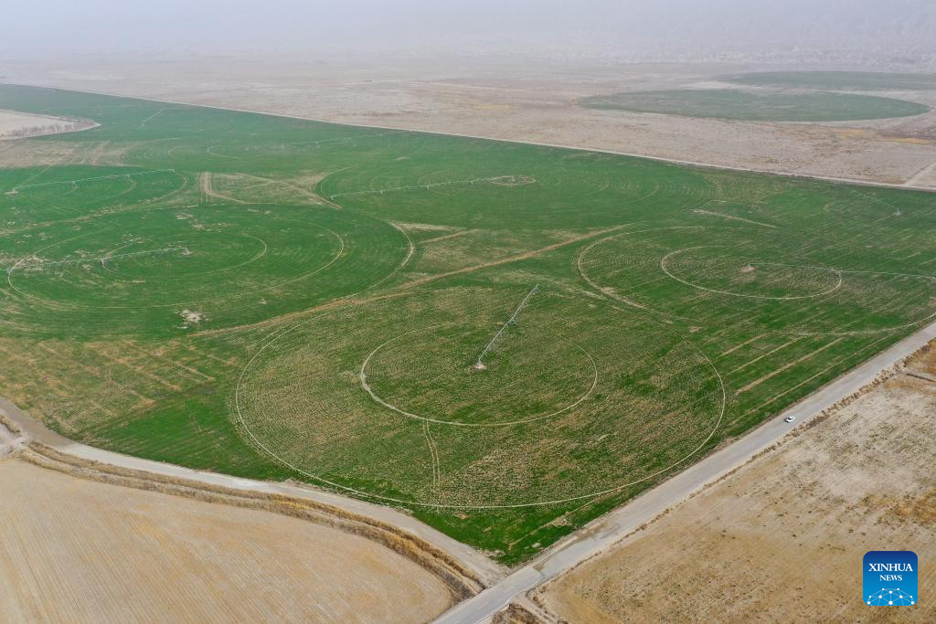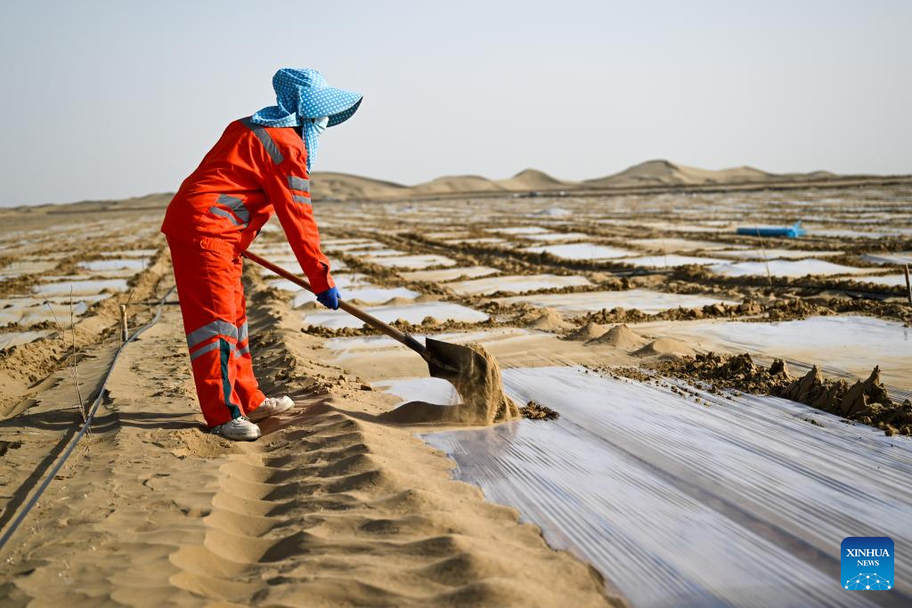URUMQI, 14 abril, 2025 (Xinhua) -- Imagen del 8 de abril de 2025 de un aldeano plantando coix en una base experimental de la industria de la arena, en el distrito de Yutian de la prefectura de Hotan, en la región autónoma uygur de Xinjiang, en el noroeste de China. El desierto de Taklimakan, en la región autónoma uygur de Xinjiang, en el noroeste de China, cubre 337.600 kilómetros cuadrados y su circunferencia mide 3.046 kilómetros, lo que lo convierte en el desierto más grande de China y el segundo desierto flotante más grande del mundo. El Taklimakan está ahora completamente rodeado por un cinturón verde, gracias a más de cuatro décadas de esfuerzos como parte del Programa de la Franja Forestal Protectora de los Tres Nortes, el programa de forestación más grande del mundo para enfrentar la desertificación. (Xinhua/Ding Lei)