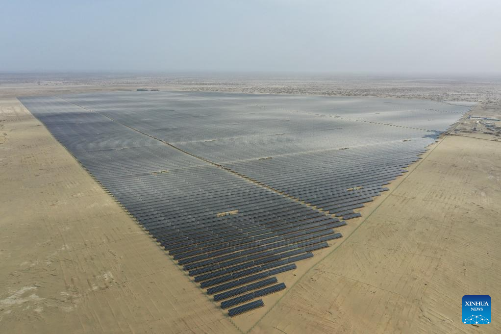 URUMQI, 14 abril, 2025 (Xinhua) -- Vista aérea tomada con un dron el 13 de abril de 2025 de un proyecto de energía fotovoltaica, en el distrito de Xayar, en la prefectura de Aksu, en la región autónoma uygur de Xinjiang, en el noroeste de China. El desierto de Taklimakan, en la región autónoma uygur de Xinjiang, en el noroeste de China, cubre 337.600 kilómetros cuadrados y su circunferencia mide 3.046 kilómetros, lo que lo convierte en el desierto más grande de China y el segundo desierto flotante más grande del mundo. El Taklimakan está ahora completamente rodeado por un cinturón verde, gracias a más de cuatro décadas de esfuerzos como parte del Programa de la Franja Forestal Protectora de los Tres Nortes, el programa de forestación más grande del mundo para enfrentar la desertificación. (Xinhua/Ding Lei)