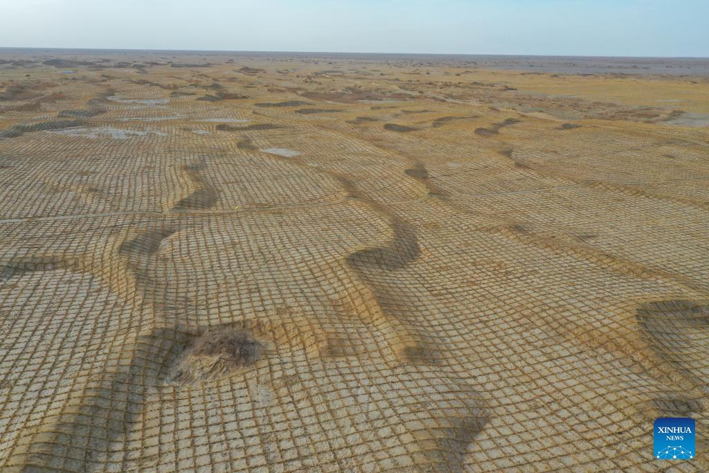 URUMQI, 14 abril, 2025 (Xinhua) -- Vista aérea tomada con un dron el 8 de abril de 2025 de barreras de arena en forma de tablero de ajedrez, en el distrito de Minfeng de la prefectura de Hotan, en la región autónoma uygur de Xinjiang, en el noroeste de China. El desierto de Taklimakan, en la región autónoma uygur de Xinjiang, en el noroeste de China, cubre 337.600 kilómetros cuadrados y su circunferencia mide 3.046 kilómetros, lo que lo convierte en el desierto más grande de China y el segundo desierto flotante más grande del mundo. El Taklimakan está ahora completamente rodeado por un cinturón verde, gracias a más de cuatro décadas de esfuerzos como parte del Programa de la Franja Forestal Protectora de los Tres Nortes, el programa de forestación más grande del mundo para enfrentar la desertificación. (Xinhua/Ding Lei)