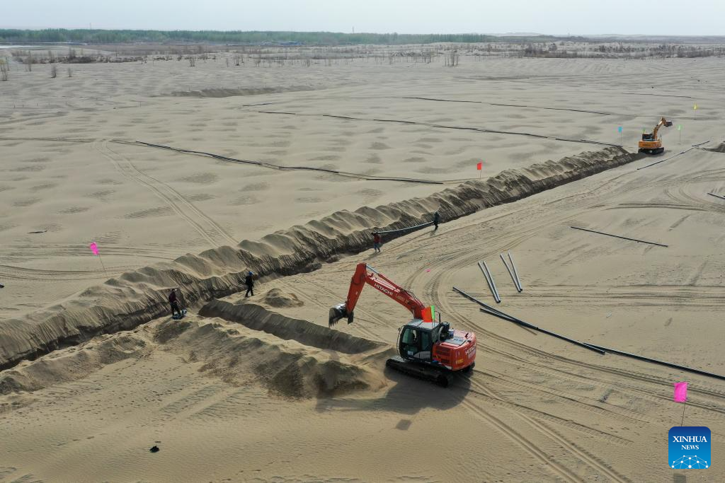 URUMQI, 14 abril, 2025 (Xinhua) -- Vista aérea tomada con un dron el 8 de abril de 2025 de trabajadores empotrando tuberías de agua, en el distrito de Minfeng de la prefectura de Hotan, en la región autónoma uygur de Xinjiang, en el noroeste de China. El desierto de Taklimakan, en la región autónoma uygur de Xinjiang, en el noroeste de China, cubre 337.600 kilómetros cuadrados y su circunferencia mide 3.046 kilómetros, lo que lo convierte en el desierto más grande de China y el segundo desierto flotante más grande del mundo. El Taklimakan está ahora completamente rodeado por un cinturón verde, gracias a más de cuatro décadas de esfuerzos como parte del Programa de la Franja Forestal Protectora de los Tres Nortes, el programa de forestación más grande del mundo para enfrentar la desertificación. (Xinhua/Ding Lei)