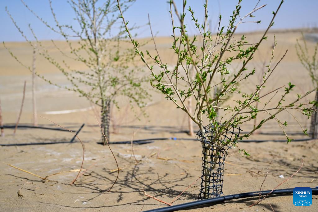 URUMQI, 14 abril, 2025 (Xinhua) -- Imagen del 9 de abril de 2025 de redes protectoras atadas a plantones para evitar que los animales se los coman en una base de control de arena, en el distrito de Qiemo, en la prefectura autónoma mongola de Bayingolin, en la región autónoma uygur de Xinjiang, en el noroeste de China. El desierto de Taklimakan, en la región autónoma uygur de Xinjiang, en el noroeste de China, cubre 337.600 kilómetros cuadrados y su circunferencia mide 3.046 kilómetros, lo que lo convierte en el desierto más grande de China y el segundo desierto flotante más grande del mundo. El Taklimakan está ahora completamente rodeado por un cinturón verde, gracias a más de cuatro décadas de esfuerzos como parte del Programa de la Franja Forestal Protectora de los Tres Nortes, el programa de forestación más grande del mundo para enfrentar la desertificación. (Xinhua/Ding Lei)