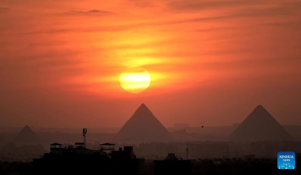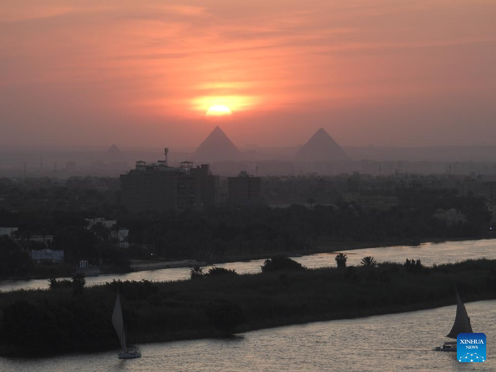 EL CAIRO, 15 abril, 2025 (Xinhua) -- Imagen del 14 de abril de 2025 de las Pirámides de Giza al atardecer vistas desde El Cairo, Egipto. (Xinhua/Wang Dongzhen)