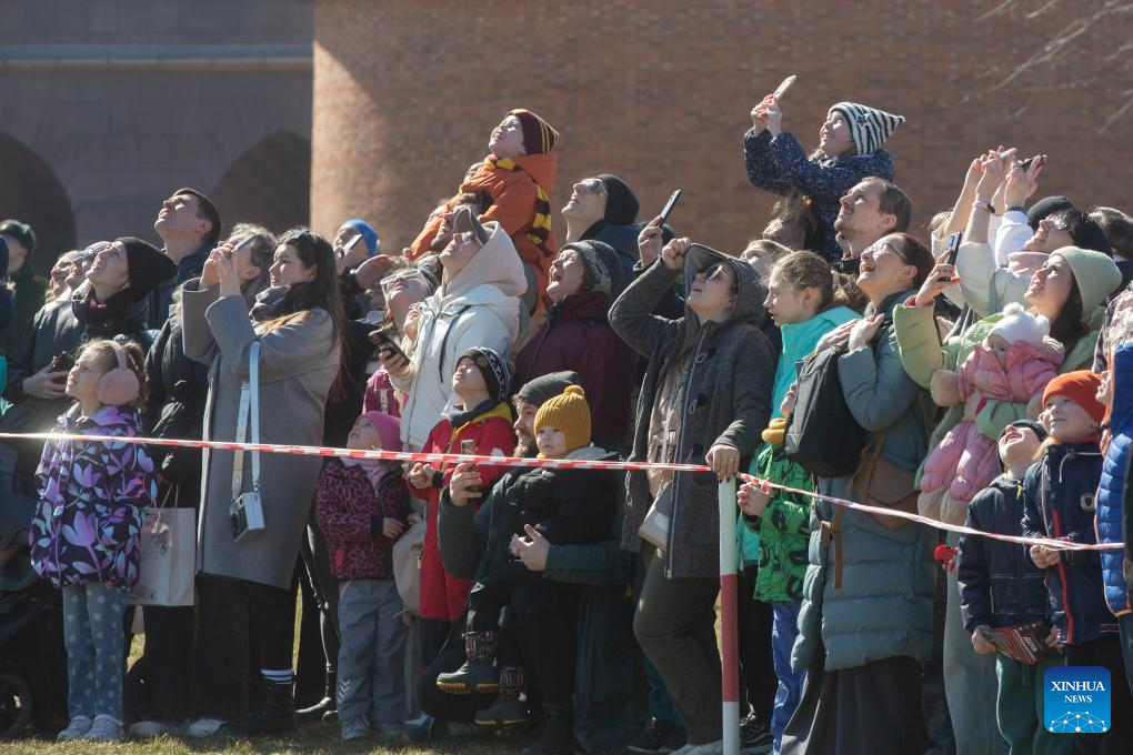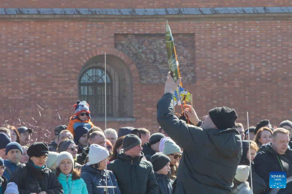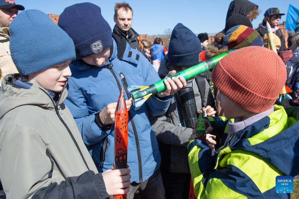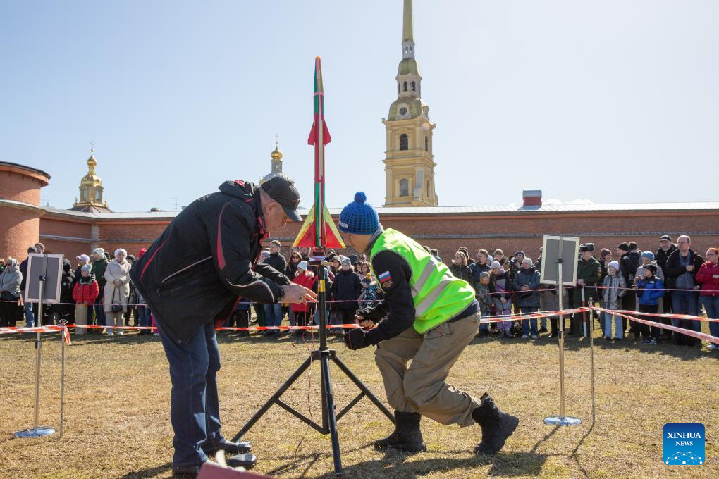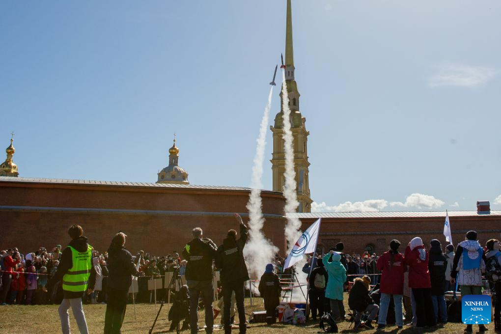 SAN PETERSBURGO, 14 abril, 2025 (Xinhua) -- Imagen del 13 de abril de 2025 de un evento de lanzamiento de cohetes celebrado en San Petersburgo, Rusia. Un evento de lanzamiento de modelo de cohete se llevó a cabo aquí el domingo en celebración del Día de la Cosmonáutica de Rusia, que conmemora el primer vuelo espacial tripulado del 12 de abril de 1961 por el cosmonauta soviético Yuri Gagarin. (Xinhua/Irina Motina)