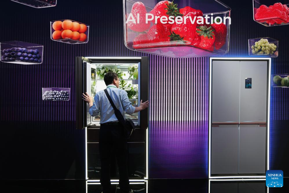 GUANGZHOU, 16 abril, 2025 (Xinhua) -- Un comprador conoce sobre un refrigerador inteligente durante la 137ª edición de la Feria de Importación y Exportación de China, en Guangzhou, en la provincia de Guangdong, en el sur de China, el 16 de abril de 2025. La 137ª edición de la Feria de Importación y Exportación de China, también conocida como la Feria de Cantón, se inauguró el martes, con el número de expositores de exportación superando los 30.000 por primera vez en la historia de este famoso evento. Productos que reflejan el concepto de innovación ecológica, incluidos dispositivos inteligentes de ahorro de energía y productos tecnológicos ecológicos, han ganado el favor de los comerciantes extranjeros durante la feria. (Xinhua/Lu Hanxin)