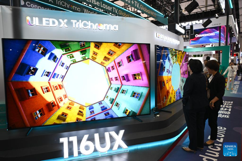 GUANGZHOU, 16 abril, 2025 (Xinhua) -- Visitantes observan una televisión de gran tamaño en la zona de exposición de productos de vida inteligente durante la 137ª edición de la Feria de Importación y Exportación de China, en Guangzhou, en la provincia de Guangdong, en el sur de China, el 16 de abril de 2025. La 137ª edición de la Feria de Importación y Exportación de China, también conocida como la Feria de Cantón, se inauguró el martes, con el número de expositores de exportación superando los 30.000 por primera vez en la historia de este famoso evento. Productos que reflejan el concepto de innovación ecológica, incluidos dispositivos inteligentes de ahorro de energía y productos tecnológicos ecológicos, han ganado el favor de los comerciantes extranjeros durante la feria. (Xinhua/Deng Hua)