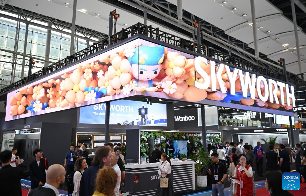 GUANGZHOU, 16 abril, 2025 (Xinhua) -- Imagen del 15 de abril de 2025 del estand de Skyworth Group de China visto en la zona de exposición de productos de vida inteligente durante la 137ª edición de la Feria de Importación y Exportación de China, en Guangzhou, en la provincia de Guangdong, en el sur de China. La 137ª edición de la Feria de Importación y Exportación de China, también conocida como la Feria de Cantón, se inauguró el martes, con el número de expositores de exportación superando los 30.000 por primera vez en la historia de este famoso evento. Productos que reflejan el concepto de innovación ecológica, incluidos dispositivos inteligentes de ahorro de energía y productos tecnológicos ecológicos, han ganado el favor de los comerciantes extranjeros durante la feria. (Xinhua/Deng Hua)