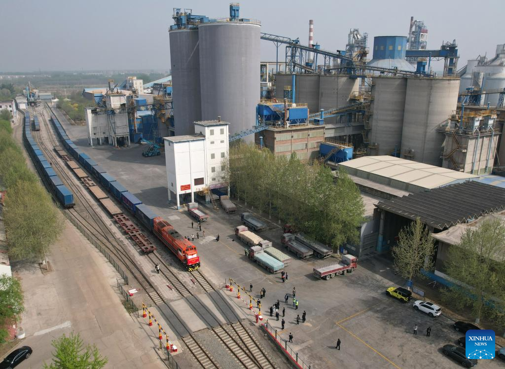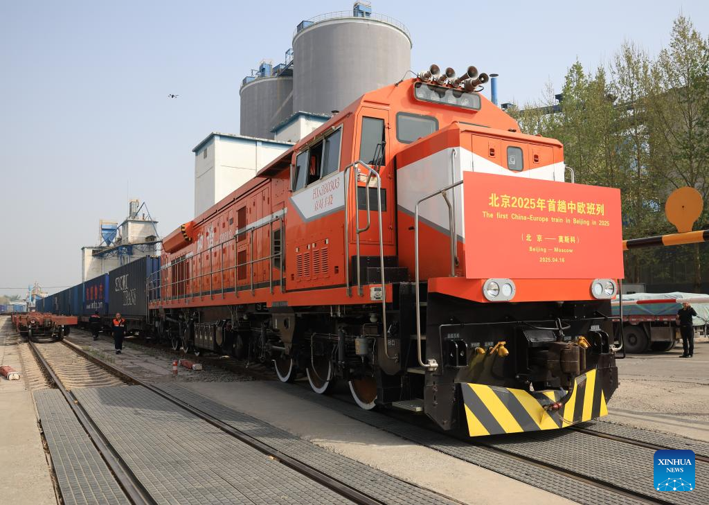 BEIJING, 16 abril, 2025 (Xinhua) -- Un tren de carga China-Europa con destino a Moscú, Rusia, espera para partir en un centro logístico, en Beijing, capital de China, el 16 de abril de 2025. Beijing envió el miércoles su primer tren de carga China-Europa en 2025. Se estima que el tren cubrirá una distancia de unos 9.000 kilómetros en 16 días. (Xinhua/Zhang Chenlin)