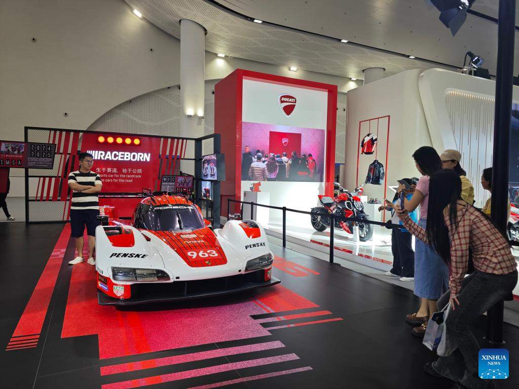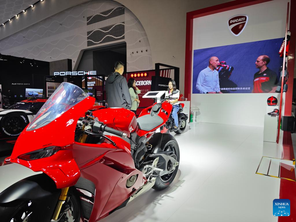 HAIKOU, 16 abril, 2025 (Xinhua) -- Imagen del 14 de abril de 2025 de visitantes observando motocicletas Ducati en la V Exposición Internacional de Productos de Consumo de China (CICPE, por sus siglas en inglés), en Haikou, en la provincia de Hainan, en el sur de China. En el área de exhibición de estilo de vida de moda de la exposición de consumo en curso, seis marcas de Volkswagen Group de China, incluidas Volkswagen, Audi, Porsche y Bentley, mostraron los últimos avances en lujo y movilidad eléctrica. (Xinhua/Zhou Huimin)