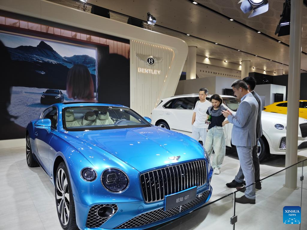 HAIKOU, 16 abril, 2025 (Xinhua) -- Imagen del 15 de abril de 2025 de visitantes observando un automóvil Bentley en la V Exposición Internacional de Productos de Consumo de China (CICPE, por sus siglas en inglés), en Haikou, en la provincia de Hainan, en el sur de China. En el área de exhibición de estilo de vida de moda de la exposición de consumo en curso, seis marcas de Volkswagen Group de China, incluidas Volkswagen, Audi, Porsche y Bentley, mostraron los últimos avances en lujo y movilidad eléctrica. (Xinhua/Zhou Huimin)