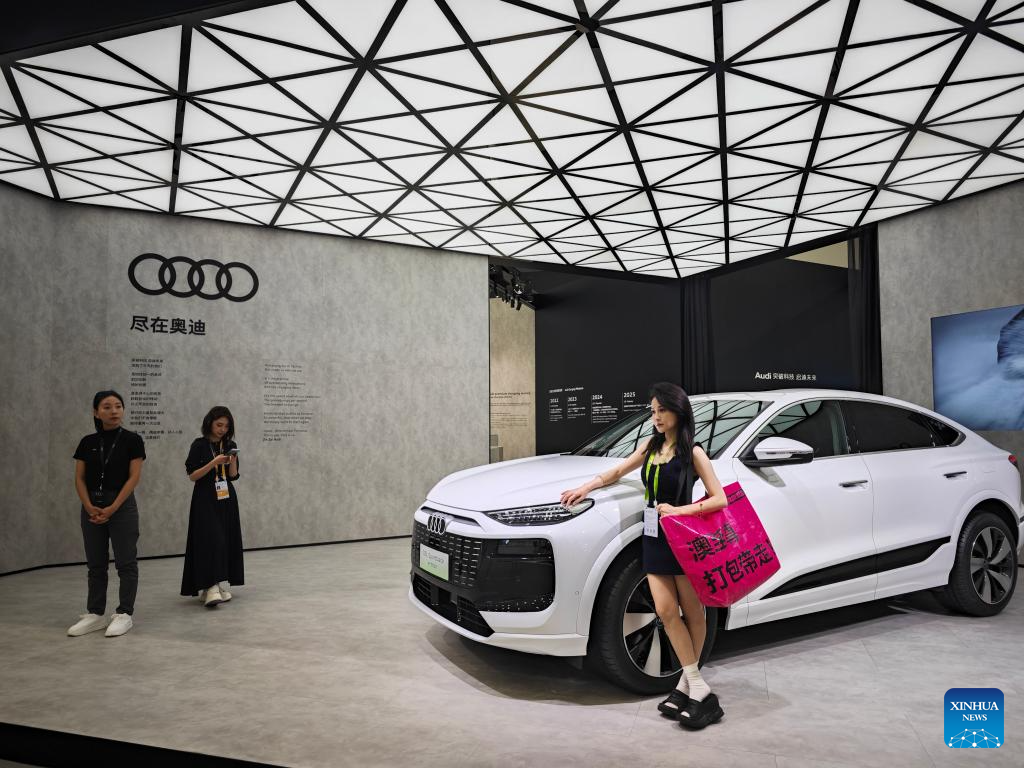 HAIKOU, 16 abril, 2025 (Xinhua) -- Imagen del 15 de abril de 2025 del estand de Audi en la V Exposición Internacional de Productos de Consumo de China (CICPE, por sus siglas en inglés), en Haikou, en la provincia de Hainan, en el sur de China. En el área de exhibición de estilo de vida de moda de la exposición de consumo en curso, seis marcas de Volkswagen Group de China, incluidas Volkswagen, Audi, Porsche y Bentley, mostraron los últimos avances en lujo y movilidad eléctrica. (Xinhua/Zhou Huimin)