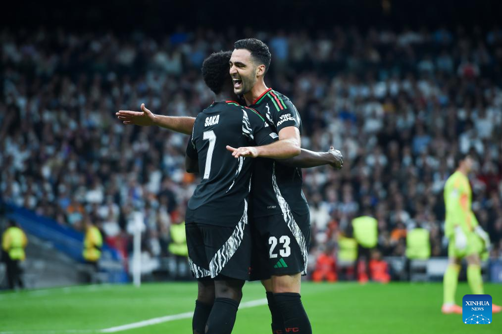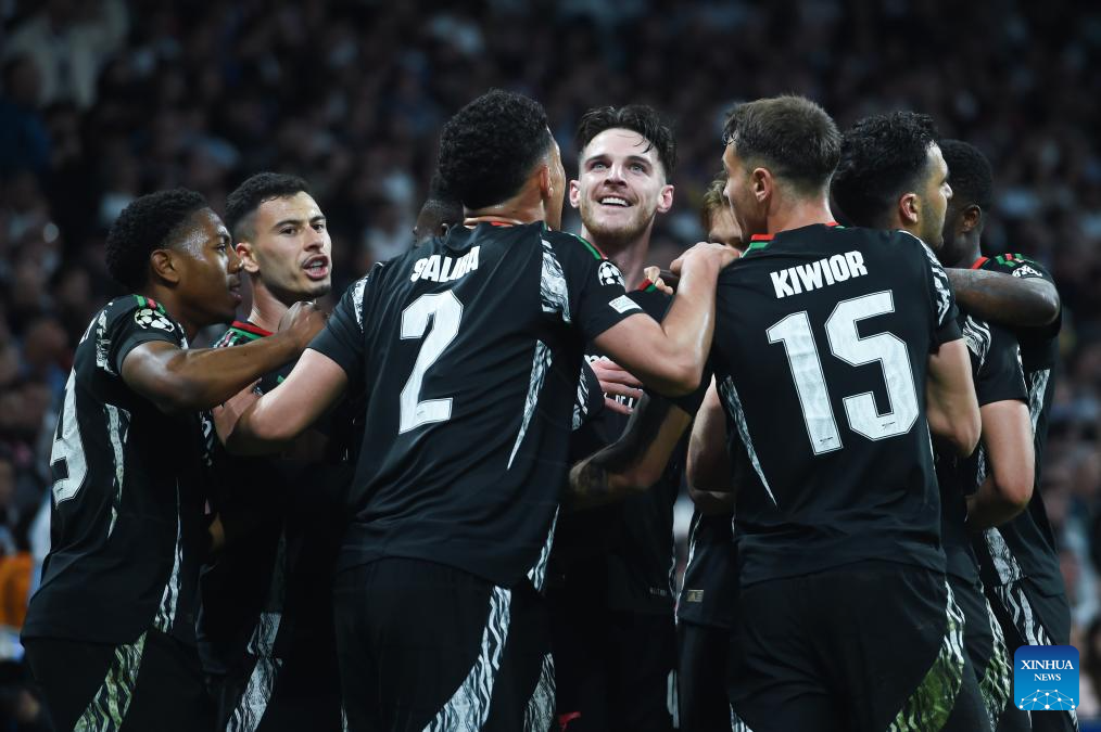 MADRID, 17 abril, 2025 (Xinhua) -- Imagen del 16 de abril de 2025 de jugadores de Arsenal festejando una anotación de su compañero de equipo Bukayo Saka durante el partido de vuelta de cuartos de final de la Liga de Campeones de la UEFA entre Real Madrid y Arsenal, en Madrid, España. (Xinhua/Gustavo Valiente)