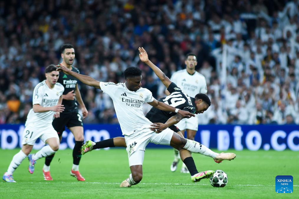 MADRID, 17 abril, 2025 (Xinhua) -- Imagen del 16 de abril de 2025 de Aurelien Tchouameni (i-frente), de Real Madrid, disputando el balón con Myles Lewis-Skelly, de Arsenal, durante el partido de vuelta de cuartos de final de la Liga de Campeones de la UEFA entre Real Madrid y Arsenal, en Madrid, España. (Xinhua/Gustavo Valiente)