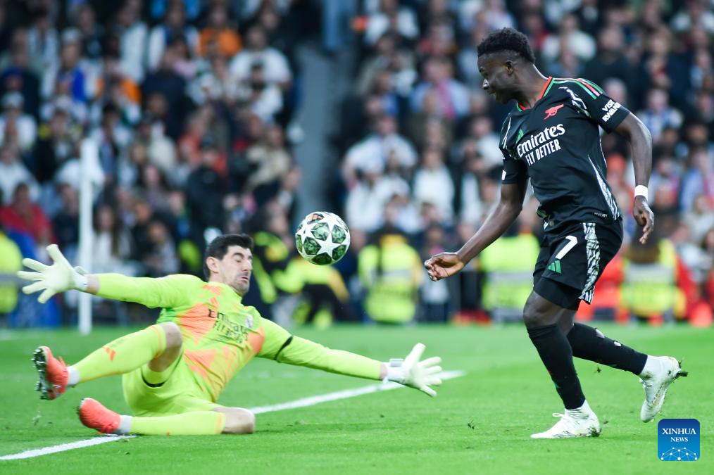 MADRID, 17 abril, 2025 (Xinhua) -- Imagen del 16 de abril de 2025 de Bukayo Saka (d), de Arsenal, realizando una anotación ante el guardameta, Thibaut Courtois, de Real Madrid, durante el partido de vuelta de cuartos de final de la Liga de Campeones de la UEFA entre Real Madrid y Arsenal, en Madrid, España. (Xinhua/Gustavo Valiente)