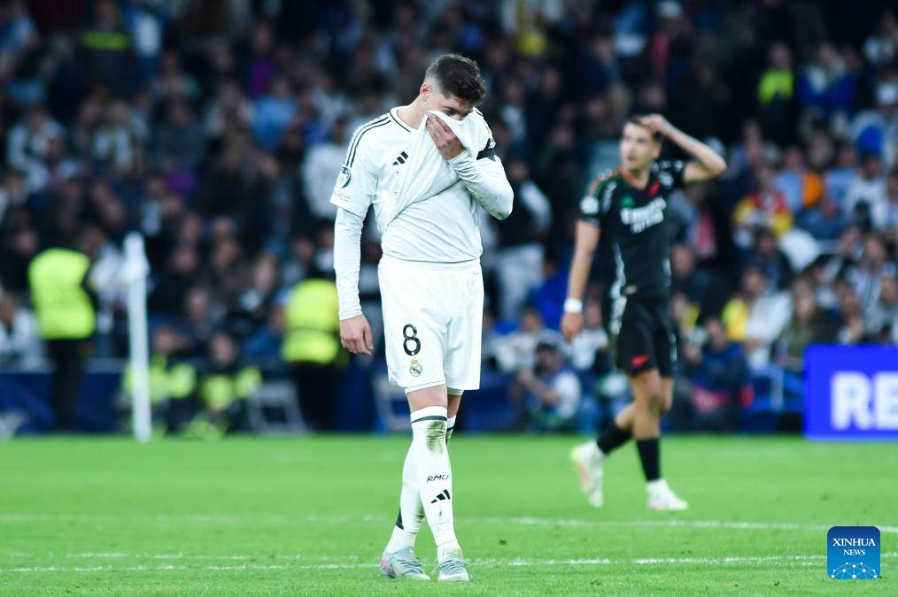 MADRID, 17 abril, 2025 (Xinhua) -- Imagen del 16 de abril de 2025 de Federico Valverde, de Real Madrid, reaccionando al término del partido de vuelta de cuartos de final de la Liga de Campeones de la UEFA entre Real Madrid y Arsenal, en Madrid, España. (Xinhua/Gustavo Valiente)