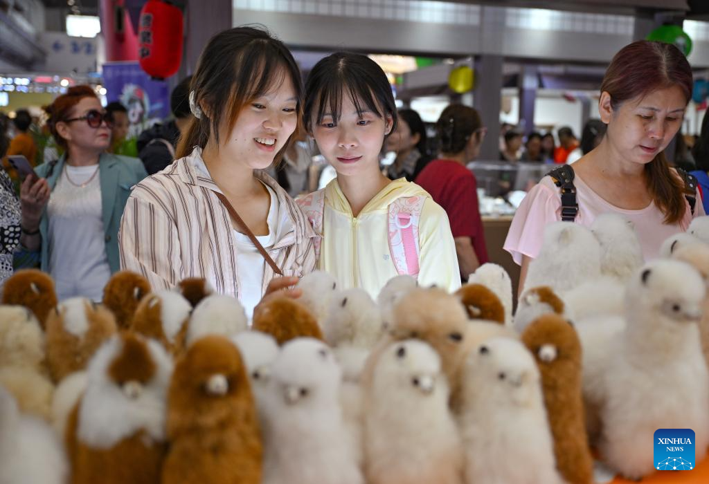 HAIKOU, 17 abril, 2025 (Xinhua) -- Visitantes seleccionan juguetes de peluche de alpaca australiana en la V Exposición Internacional de Productos de Consumo de China (CICPE, por sus siglas en inglés), en Haikou, en la provincia de Hainan, en el sur de China, el 17 de abril de 2025. La V CICPE abrió sus puertas al público en general el jueves, mostrando bienes y servicios de sectores como tecnología, cuidado de la salud, cultura, turismo y deportes. (Xinhua/Guo Cheng)