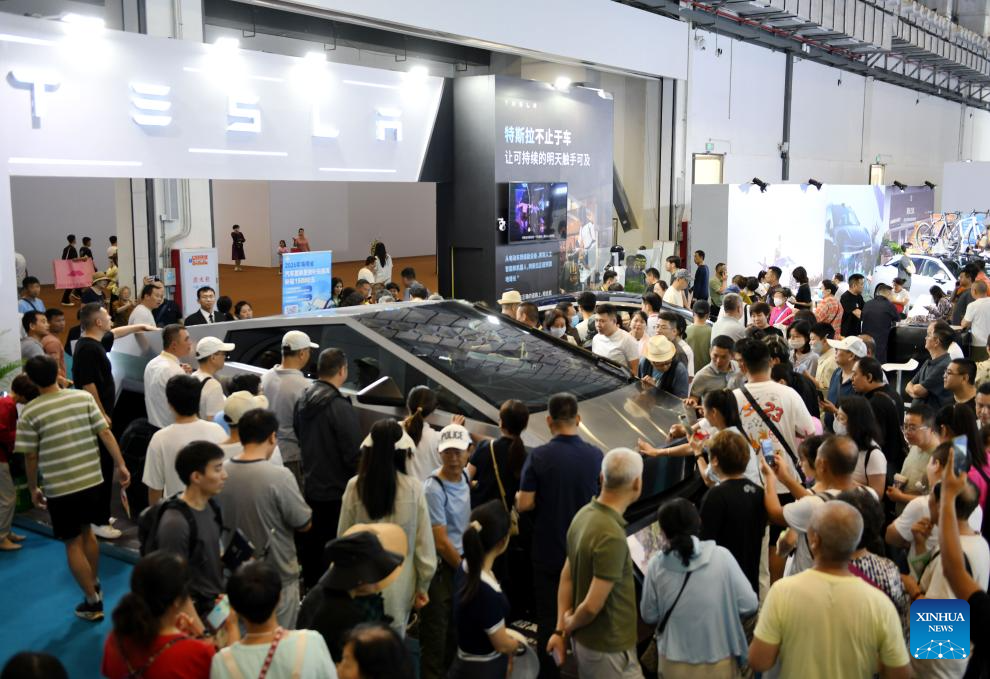 HAIKOU, 17 abril, 2025 (Xinhua) -- Personas visitan un estand de Tesla en la V Exposición Internacional de Productos de Consumo de China (CICPE, por sus siglas en inglés), en Haikou, en la provincia de Hainan, en el sur de China, el 17 de abril de 2025. La V CICPE abrió sus puertas al público en general el jueves, mostrando bienes y servicios de sectores como tecnología, cuidado de la salud, cultura, turismo y deportes. (Xinhua/Sun Xiaotian)