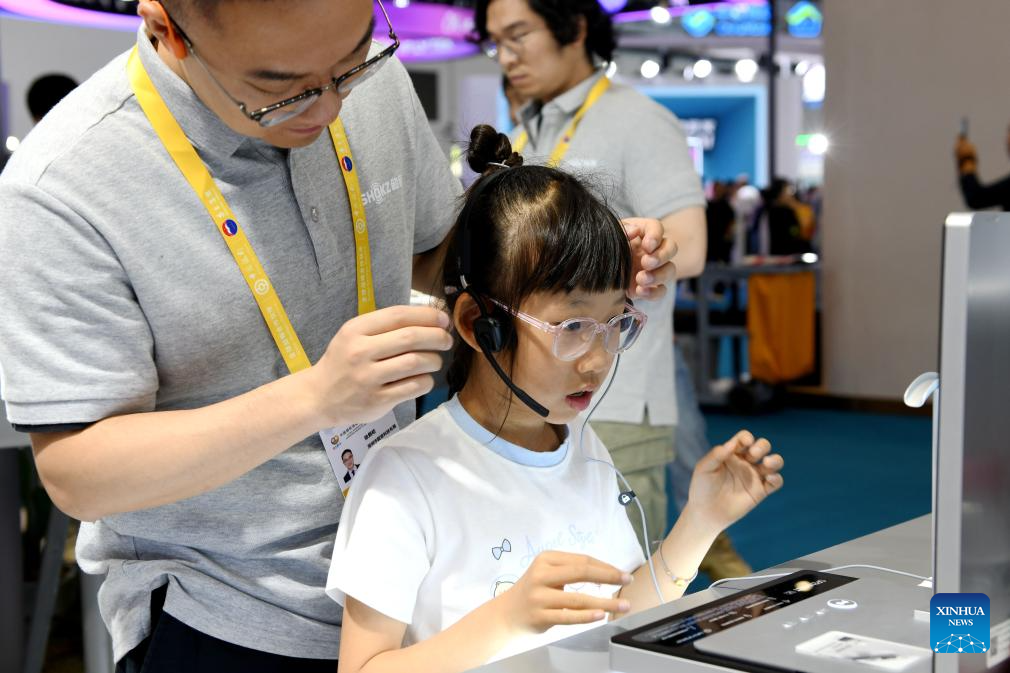 HAIKOU, 17 abril, 2025 (Xinhua) -- Un trabajador ayuda a una niña a probarse audífonos en un estand durante la V Exposición Internacional de Productos de Consumo de China (CICPE, por sus siglas en inglés), en Haikou, en la provincia de Hainan, en el sur de China, el 17 de abril de 2025. La V CICPE abrió sus puertas al público en general el jueves, mostrando bienes y servicios de sectores como tecnología, cuidado de la salud, cultura, turismo y deportes. (Xinhua/Sun Xiaotian)