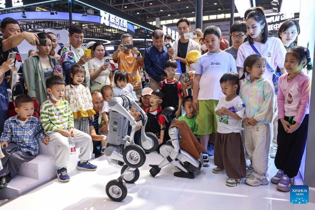 HAIKOU, 17 abril, 2025 (Xinhua) -- Personas observan un espectáculo de robots en la V Exposición Internacional de Productos de Consumo de China (CICPE, por sus siglas en inglés), en Haikou, en la provincia de Hainan, en el sur de China, el 17 de abril de 2025. La V CICPE abrió sus puertas al público en general el jueves, mostrando bienes y servicios de sectores como tecnología, cuidado de la salud, cultura, turismo y deportes. (Xinhua/Zhang Liyun)