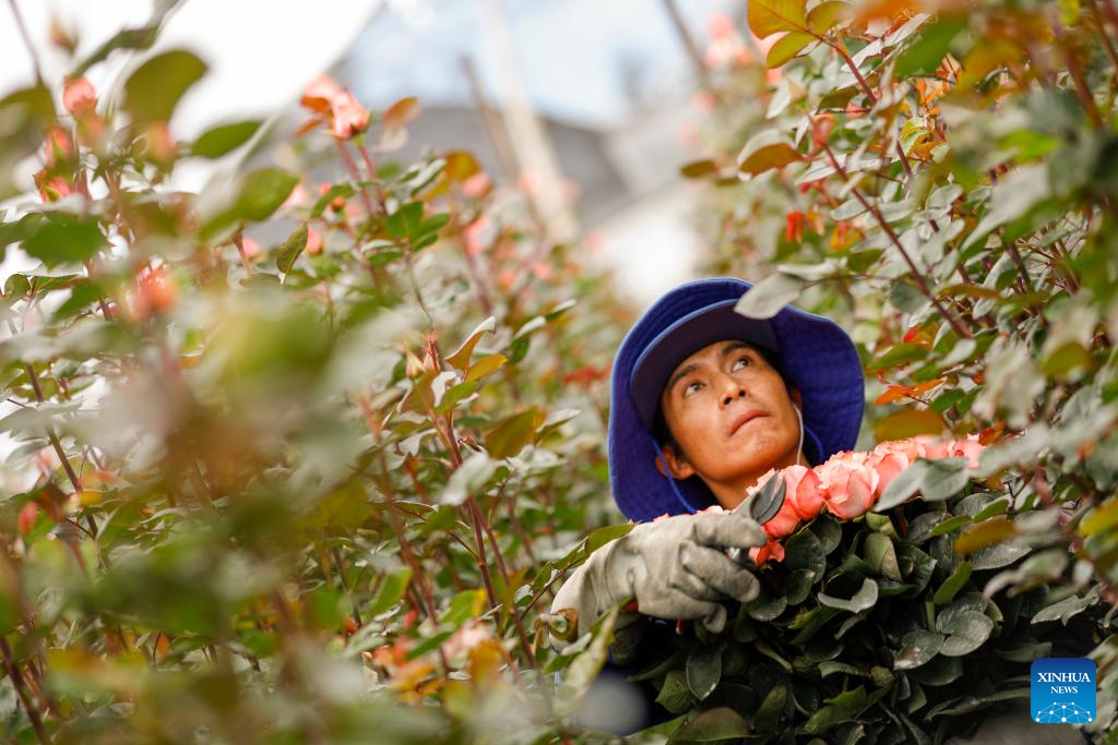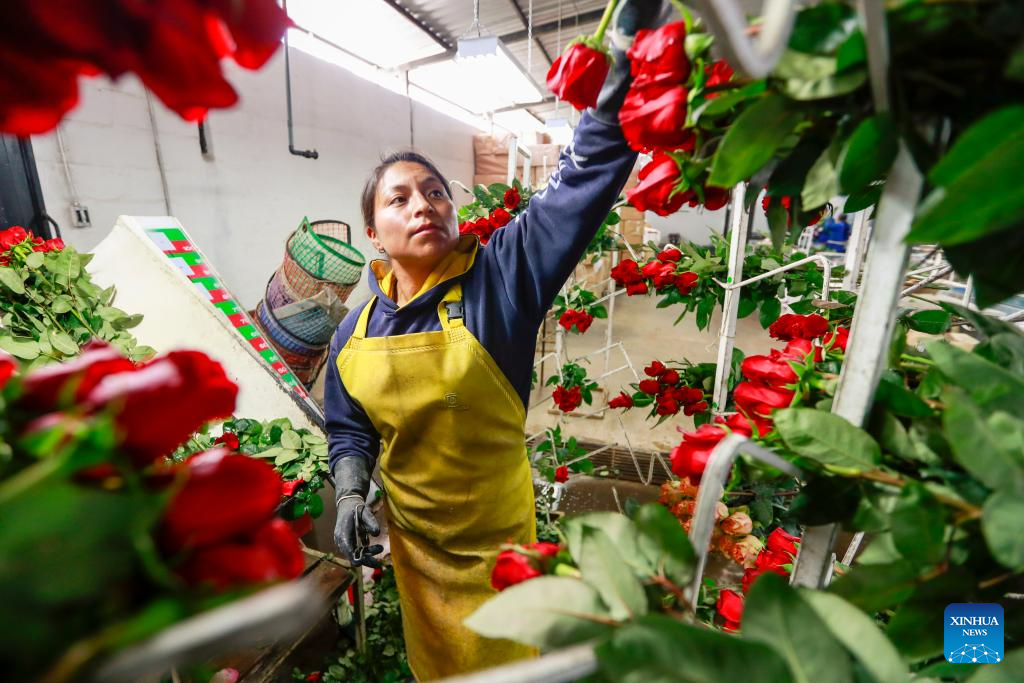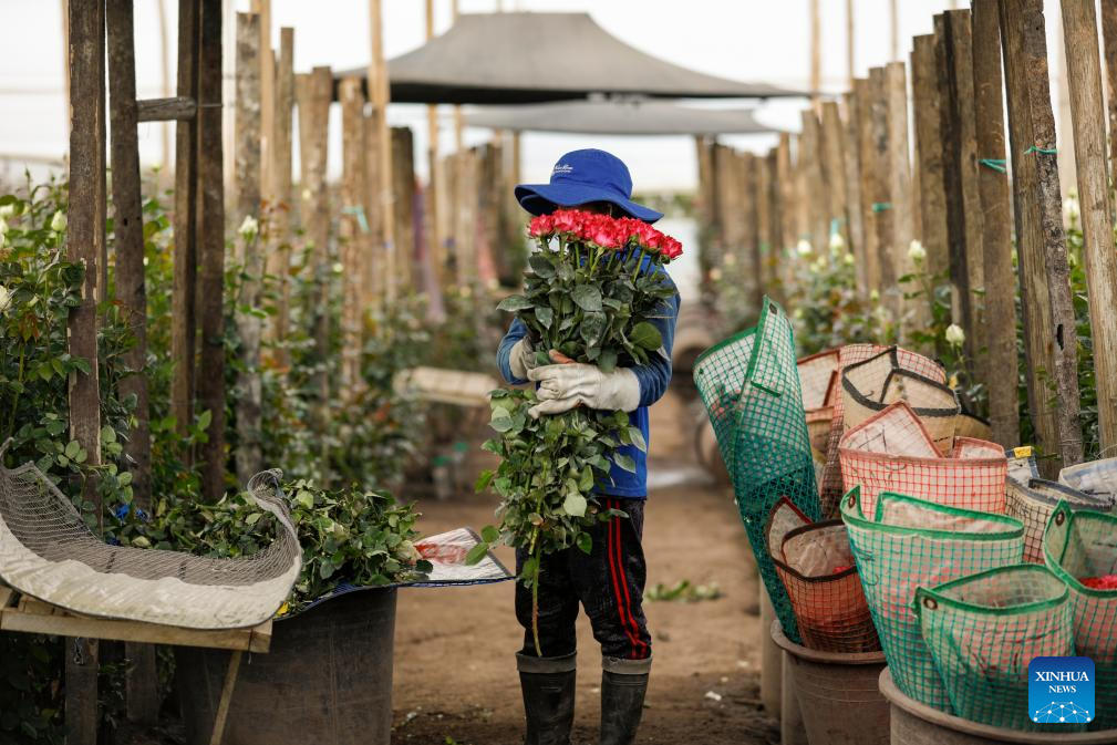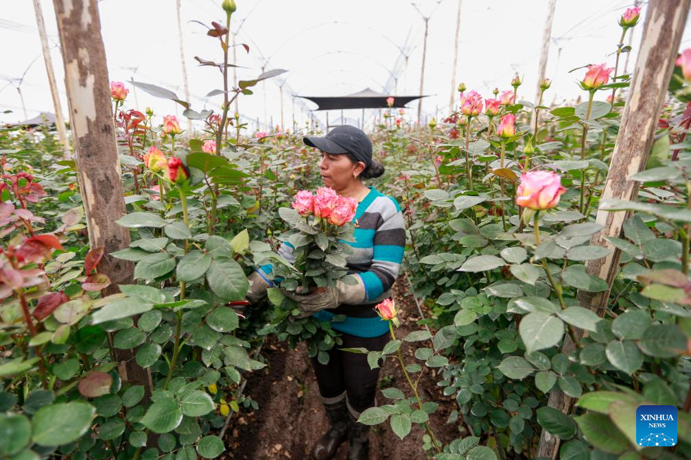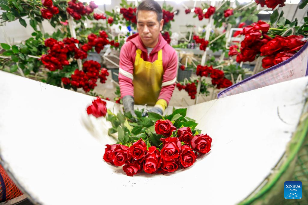 TABACUNDO, 4 mayo, 2025 (Xinhua) -- Imagen del 3 de mayo de 2025 de un trabajador de la florícola Valent Roses, mostrando rosas para su exportación, en la ciudad de Tabacundo, en el norte de Ecuador. (Xinhua/Ricardo Landeta)