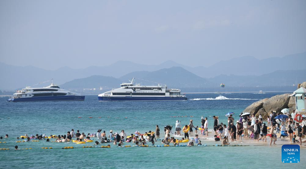 SANYA, 4 mayo, 2025 (Xinhua) -- Imagen del 3 de mayo de 2025 de turistas disfrutando en la playa de la Isla Wuzhizhou, en Sanya, en la provincia de Hainan, en el sur de China. Las personas a través de China disfrutan del del feriado del Primero de Mayo en curso en diferentes maneras. (Xinhua/Zhao Yingquan)