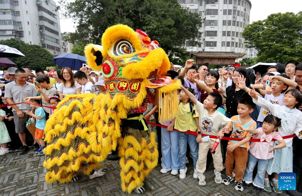 FOSHAN, 4 mayo, 2025 (Xinhua) -- Imagen del 2 de mayo de 2025 de niños interactuando con bailarines de la danza del León en un complejo de turismo y ocio, en la ciudad de Foshan, en la provincia de Guangdong, en el sur de China. Las personas a través de China disfrutan del feriado del Primero de Mayo en curso en diferentes maneras. (Xinhua/Huang Jiming)