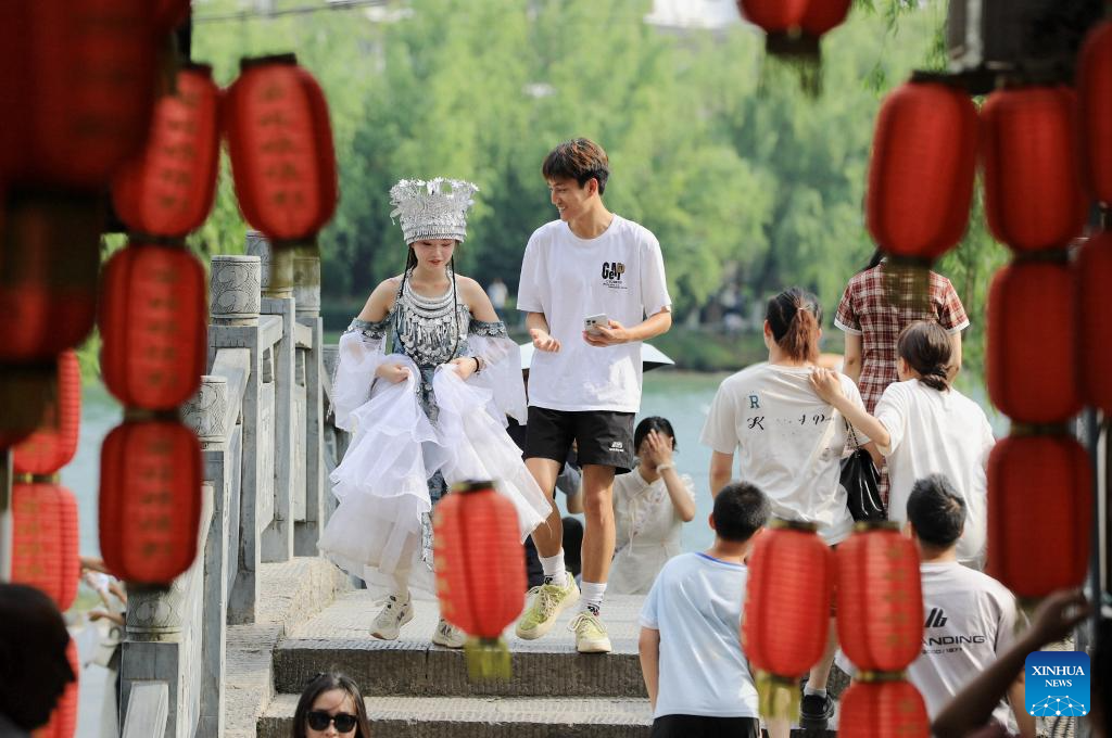 QIANDONGNAN, 4 mayo, 2025 (Xinhua) -- Imagen del 3 de mayo de 2025 de personas visitando una ciudad antigua, en la prefectura autónoma miao y dong de Qiandongnan, en la provincia de Guizhou, en el suroeste de China. Las personas a través de China disfrutan del feriado del Primero de Mayo en curso en diferentes maneras. (Xinhua/Tai Shengzhi)