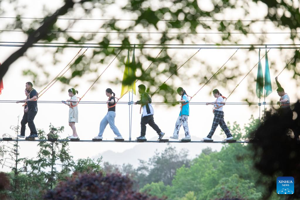 LOUDI, 4 mayo, 2025 (Xinhua) -- Imagen del 3 de mayo de 2025 de turistas visitando un parque ecológico, en la ciudad de Loudi, en la provincia de Hunan, en el centro de China. Las personas a través de China disfrutan del feriado del Primero de Mayo en curso en diferentes maneras. (Xinhua/Wu Yonghua)