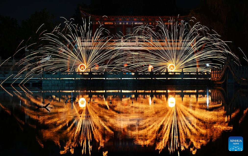 TENGZHOU, 4 mayo, 2025 (Xinhua) -- Imagen del 3 de mayo de 2025 de artistas folclóricos realizando un espectáculo de fuegos artificiales de hierro fundido, en Tengzhong, en la provincia de Shandong, en el este de China. Las personas a través de China disfrutan del feriado del Primero de Mayo en curso en diferentes maneras. (Xinhua/Li Zhijun)