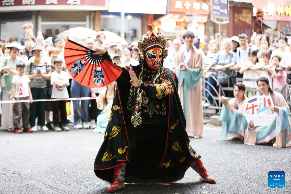 LESHAN, 4 mayo, 2025 (Xinhua) -- Imagen del 3 de mayo de 2025 de personas observando una presentación de Bianlian, o cambio de cara, como parte de la ópera de Sichuan, en una calle cultural, en la ciudad de Leshan, en la provincia de Sichuan, en el suroeste de China. Las personas a través de China disfrutan del feriado del Primero de Mayo en curso en diferentes maneras. (Xinhua/Li Huashi)