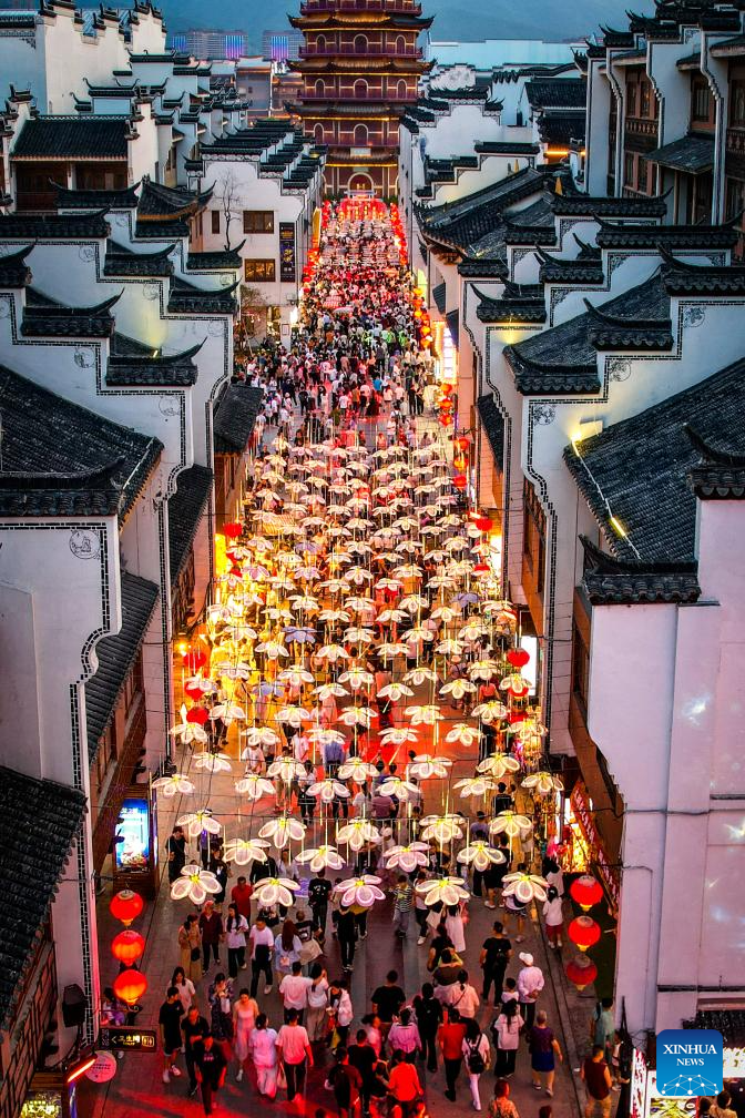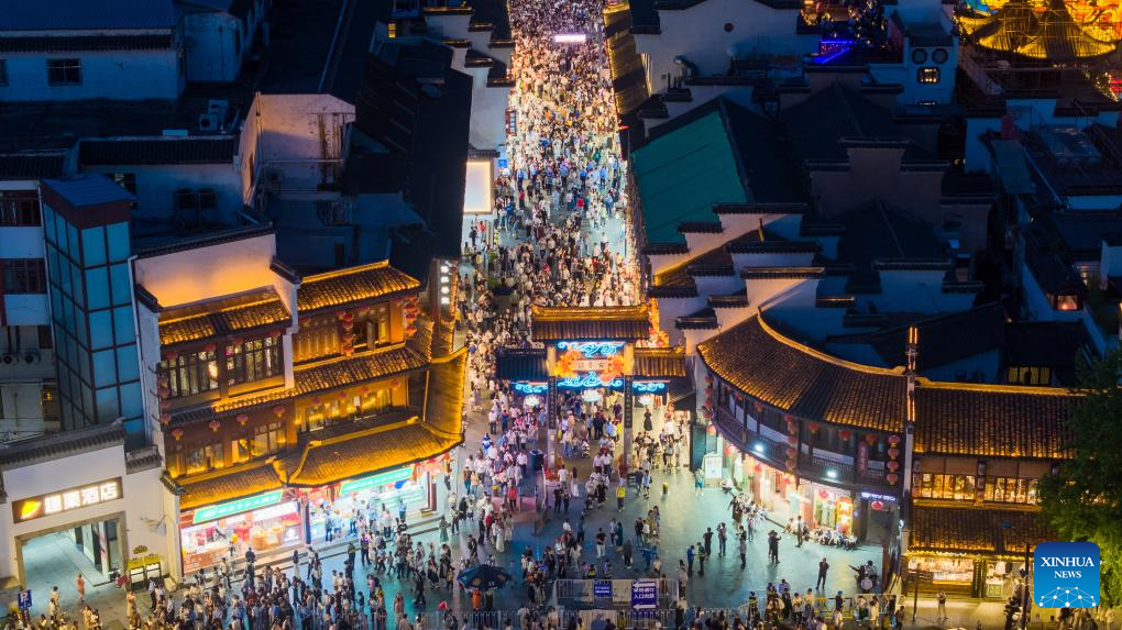 NANJING, 4 mayo, 2025 (Xinhua) -- Vista aérea tomada con un dron el 3 de mayo de 2025 de turistas visitando el área escénica de Fuzimiao, en Nanjing, en la provincia de Jiangsu, en el este de China. Personas a través de China disfrutan del feriado del Primero de Mayo en curso en diferentes maneras. (Xinhua/Yang Suping)