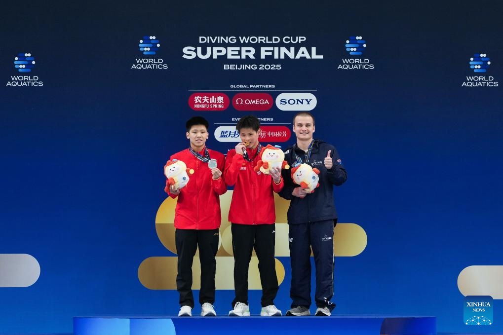 BEIJING, 4 mayo, 2025 (Xinhua) -- El medallista de oro, Zhu Zifeng (c), de China, el medallista de plata, Cheng Zilong (i), de China, y el medallista de bronce, Cassiel Rousseau, de Australia, posan para fotografías durante la ceremonia de premiación de la final de plataforma de 10m masculina en la Súper Final de la Copa del Mundo de Clavados 2025 de World Aquatics, en Beijing, capital de China, el 4 de mayo de 2025. (Xinhua/Na Yuqi)