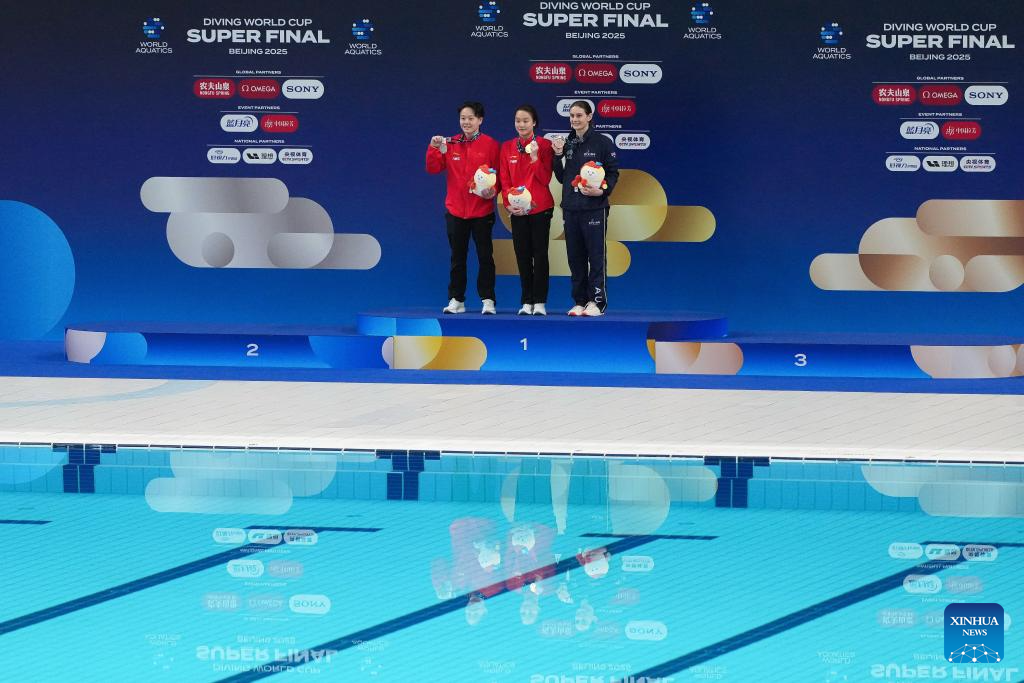 BEIJING, 4 mayo, 2025 (Xinhua) -- La medallista de oro, Chen Jia (c), de China, la medallista de plata, Chen Yiwen (i), de China, y la medallista de bronce, Maddison Keeney, de Australia, posan en el podio durante la ceremonia de premiación de la final de trampolín de 3m femenino en la Súper Final de la Copa del Mundo de Clavados 2025 de World Aquatics, en Beijing, capital de China, el 4 de mayo de 2025. (Xinhua/Na Yuqi)