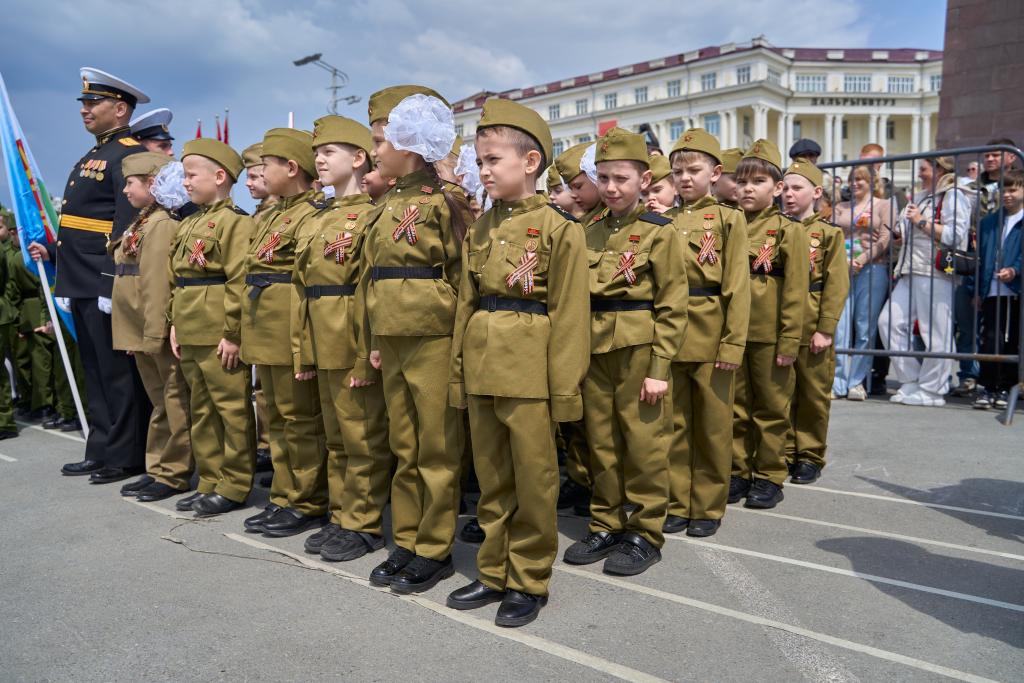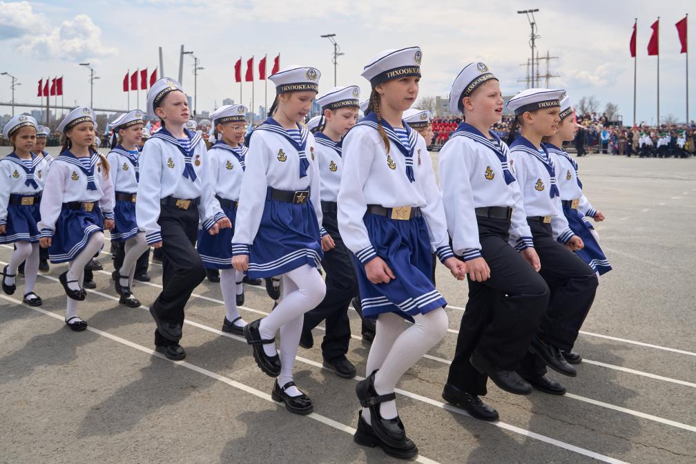 VLADIVOSTOK, 4 mayo, 2025 (Xinhua) -- Una formación de estudiantes de una escuela primaria participa en un desfile de "Los bisnietos de la Victoria" para celebrar el 80 aniversario de la Victoria en la Gran Guerra Patriótica, en Vladivostok, Rusia, el 4 de mayo de 2025. (Xinhua/Guo Feizhou)