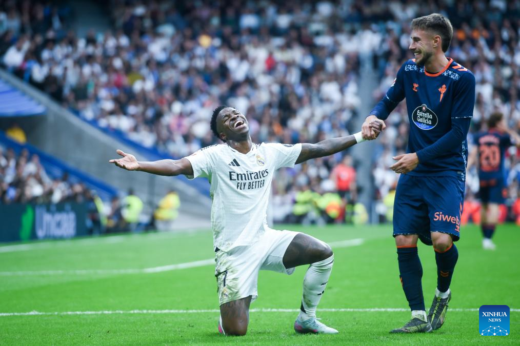 MADRID, 5 mayo, 2025 (Xinhua) -- Imagen del 4 de mayo de 2025 de Vinicius Junior (i), de Real Madrid, reaccionando durante el partido de fútbol de la LaLiga entre Real Madrid y RC Celta, en el Estadio Santiago Bernabéu, en Madrid, España. (Xinhua/Gustavo Valiente)