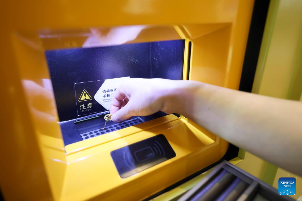 SHANGHAI, 5 mayo, 2025 (Xinhua) -- Una empleada coloca joyería de oro en un dispositivo de reciclaje de oro de una "tienda inteligente de oro" en un centro comercial, en Shanghai, en el este de China, el 5 de mayo de 2025. Recientemente, una "tienda inteligente de oro" hizo su debut en un centro comercial en Shanghai. Con funciones de autoservicio para el reciclaje y la compra de oro, el sistema inteligente de reciclaje de oro ofrece servicios como autopedido, detección automática y pago rápido. El sistema puede detectar automáticamente el peso y la pureza del oro colocado en el dispositivo, calcula la cantidad a reciclar según el precio del oro en tiempo real y procesa los pagos con agilidad, marcando un nuevo hito en el campo del reciclaje de oro. (Xinhua/Wang Xiang)