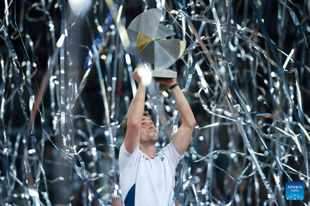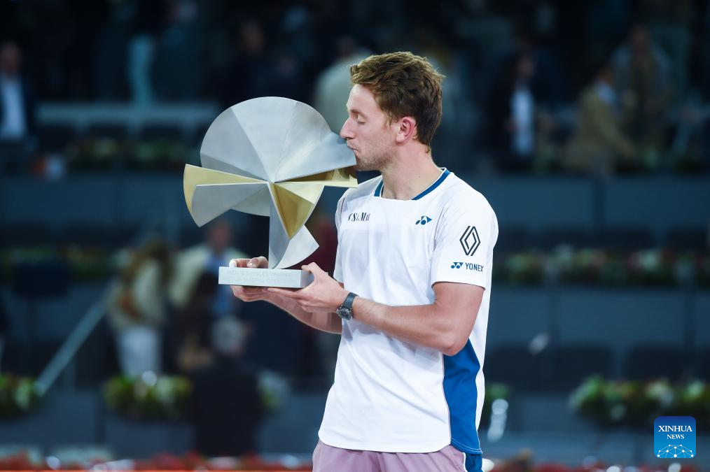 MADRID, 5 mayo, 2025 (Xinhua) -- Imagen del 4 de mayo de 2025 de Casper Ruud festejando con el trofeo después de ganar la final de individuales masculinos entre Casper Ruud, de Noruega y Jack Draper, de Reino Unido, en el torneo de tenis Madrid Open de la ATP Tour 2025, en la Caja Mágica, Madrid, España. (Xinhua/Gustavo Valiente)