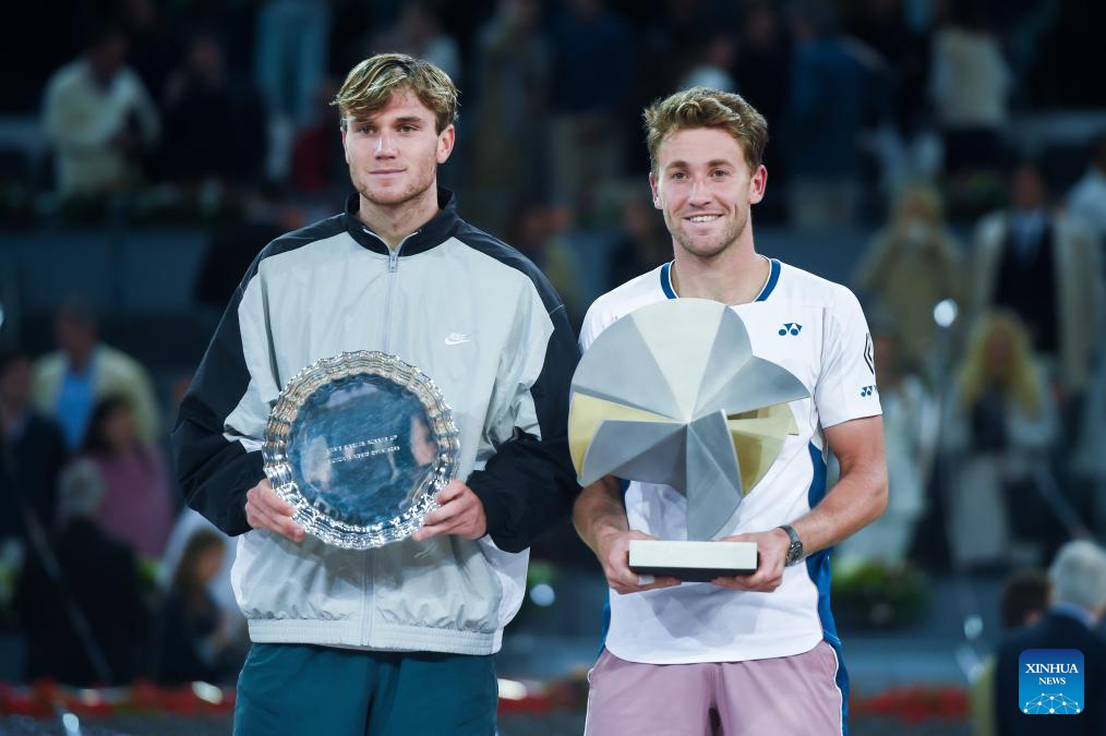MADRID, 5 mayo, 2025 (Xinhua) -- Imagen del 4 de mayo de 2025 de Casper Ruud (d) y Jack Draper posando para fotografías durante la ceremonia de premiación de la final de individuales masculinos, en el torneo de tenis Madrid Open de la ATP Tour 2025, en la Caja Mágica, Madrid, España. (Xinhua/Gustavo Valiente)