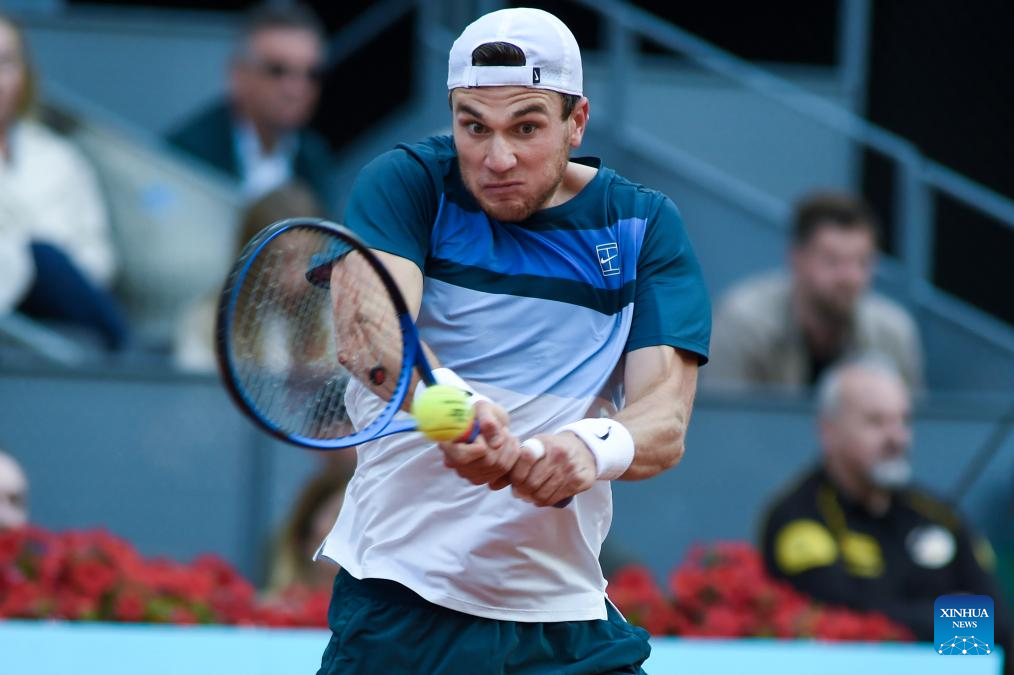 MADRID, 5 mayo, 2025 (Xinhua) -- Imagen del 4 de mayo de 2025 de Jack Draper devolviendo la pelota durante la final de individuales masculinos entre Casper Ruud, de Noruega y Jack Draper, de Reino Unido, en el torneo de tenis Madrid Open de la ATP Tour 2025, en la Caja Mágica, Madrid, España. (Xinhua/Gustavo Valiente)