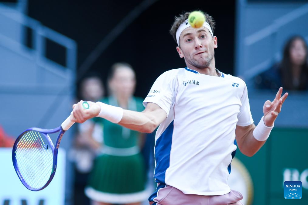 MADRID, 5 mayo, 2025 (Xinhua) -- Imagen del 4 de mayo de 2025 de Casper Ruud devolviendo la pelota durante la final de individuales masculinos entre Casper Ruud, de Noruega y Jack Draper, de Reino Unido, en el torneo de tenis Madrid Open de la ATP Tour 2025, en la Caja Mágica, Madrid, España. (Xinhua/Gustavo Valiente)