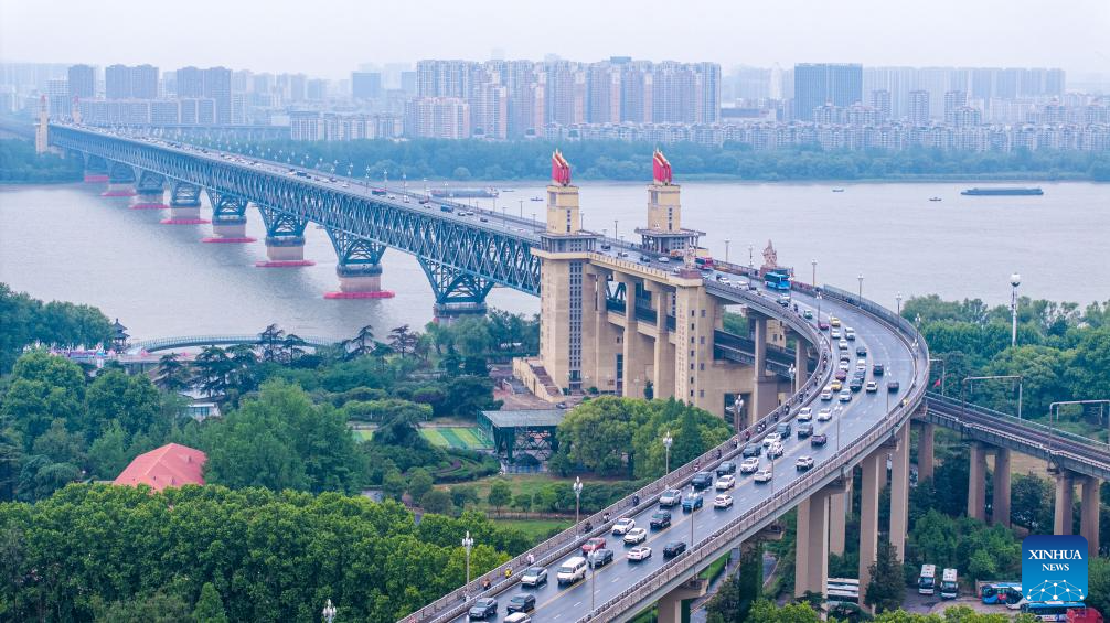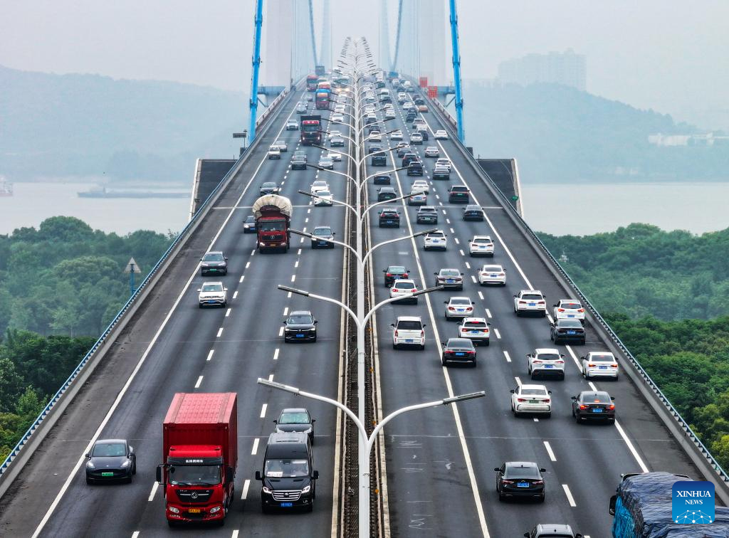BEIJING, 5 mayo, 2025 (Xinhua) -- Vista aérea tomada con un dron del flujo de tránsito en el puente de Nanjing sobre el río Yangtze, en Nanjing, en la provincia de Jiangsu, en el este de China, el 5 de mayo de 2025. En el último día del feriado del Primero de Mayo, se observó un pico en los viajes de regreso en todo el país. (Xinhua/Yang Suping)